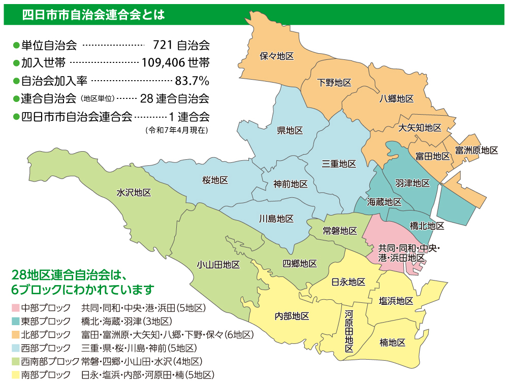 四日市市自治会連合会は、四日市市内28地区連合自治会があり、その連合体として組織をしています。本会は、各地区連合自治会相互の連絡を密にし、自治組織の向上発展に努め、関係行政機関との連絡を図り、地域住民の福祉の向上と豊かな地域社会づくりに寄与しています。