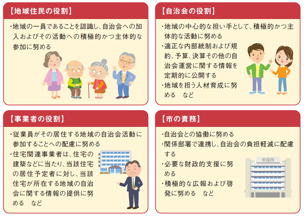 四日市市では令和2年4月1日より「四日市市自治会加入の促進と自治会活動推進のための条例」を施行しております。この条例は、自治会の活性化を推進するために、地域住民の自治会加入および参加に関し、地域住民や自治会、事業者の役割を定めたものです。自治会は強制加入団体ではありませんが、市民の皆さまが積極的に地域と関わるきっかけにしてください。