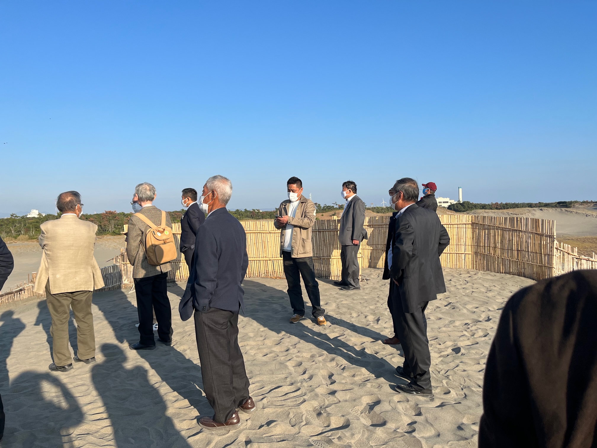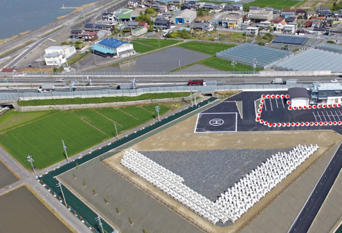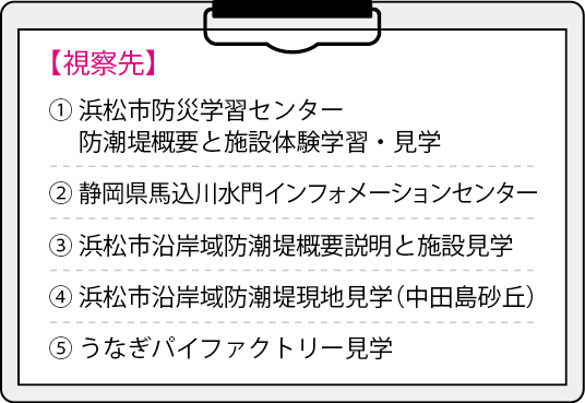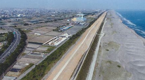 東日本大震災による被害を受け、甚大な津波被害が想定される南海トラフ巨大地震に備え、2012年6月に静岡県・浜松市は一条工務店から、300億円という異例の寄付を受け、県、市、一条工務店の三者によって「浜松市沿岸域の防潮堤等の整備に関する三者基本合意」が締結されました。その寄付金を原資に浜名湖から天竜川河口までの約17.5㎞の防潮堤の整備を、総力を挙げてオール浜松で取り組み、総事業費約330億円、6年9か月かけて2020年3月に完成しました。 防潮堤は、海抜13メートル程度の高さを基本にし、CSG工法というダムをつくる工法で築造されており、単純な盛土とは異なる津波の波力に耐えられるように設計されています。 今回は、凧揚げで有名な中田島砂丘から防潮堤を見学しました。