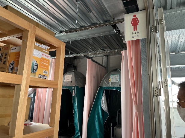 2階は避難場所と備蓄倉庫を併設。2階には7基の太陽光式センサー調光型LED照明を設けており、夜間の避難に対応できる。また、備蓄倉庫には津波避難タワーに避難してきた方が利用できるよう必要な資機材を備蓄。倉庫の正面に設置した地震解錠ボックスの中に倉庫の鍵が入っており、この地震解錠 ボックスは、震度5弱以上の揺れを感知すると自動的にボックスが開く仕組みとなっている。ボックス内に収納されている鍵で、倉庫の扉を解錠し、 また、倉庫内の両端は、2台ずつ簡易トイレなどが設置できるように個室スペースを確保している。