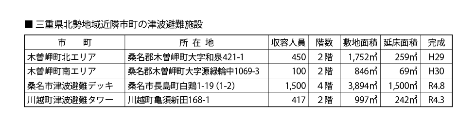 平成31年3月に完成。 平成26年度に策定した「木曽岬町津波避施設整備計画」に基づき、平成27年度から施設整備に着手。 南部地区津波避難タワーが、完成したことにより、計画していた13施設(収容人員6,562名)すべての避難施設の整備が完了。