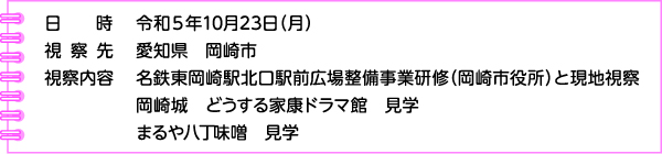 令和5年10月23日に、愛知県岡崎市の名鉄東岡崎駅前整備の現地視察と岡崎城見学の研修を行いました。四日市市にもできるペデストリアンデッキの視察をしてきました。