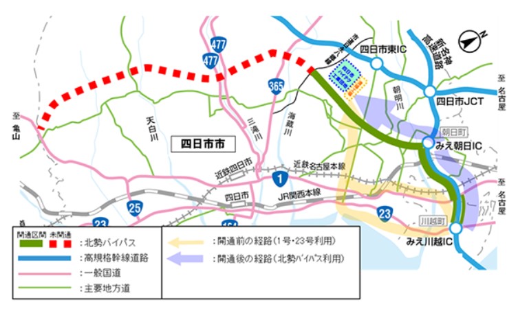 国道1号北勢バイパスは、四日市市を中心とする北勢地域のバイパスとして、国道1号・23号等の渋滞緩和、災害に強い道路機能の確保及び地域活性化の支援を目的に計画された道路です。