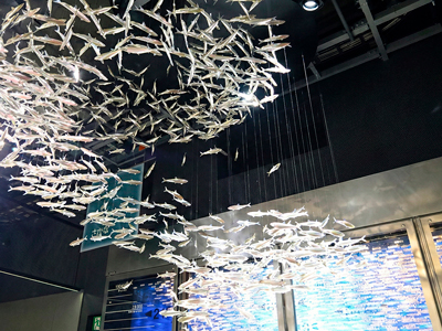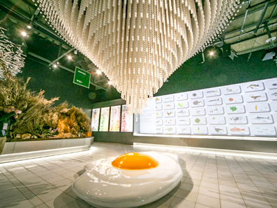 その卵の量をシャンデリア風のオブジェにし、下の目玉焼きは約28,000個分の卵の量。人は一生にどのくらいのいのちを頂くかを視覚的に展示。空中にいわしの群れが泳いでいる空間になっていました。