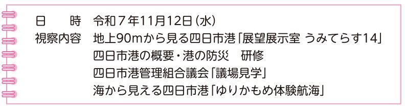 11月12日(水)に、市内視察が行われ、四日市ポートビル展望台から、四日市港の歴史、取扱貨物の状況、外貿コンテナの取り扱いについての説明を受け、その後、四日市港管理組合の防災対策の研修、四日市港管理組合の議場を見学しました。