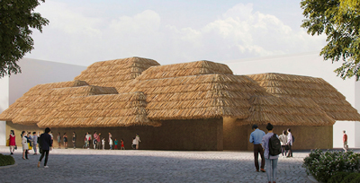 このパビリオンは、建物の建築は隈研吾氏が手がけ、黒い外壁と茅葺き屋根が印象的でした。